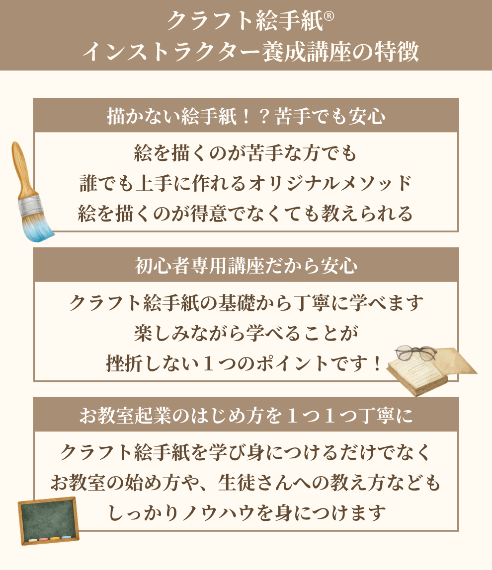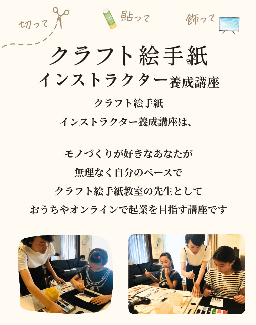 この講座ではクラフト絵手紙の基礎から、インストラクターとして教える準備を整えるところまで行います。