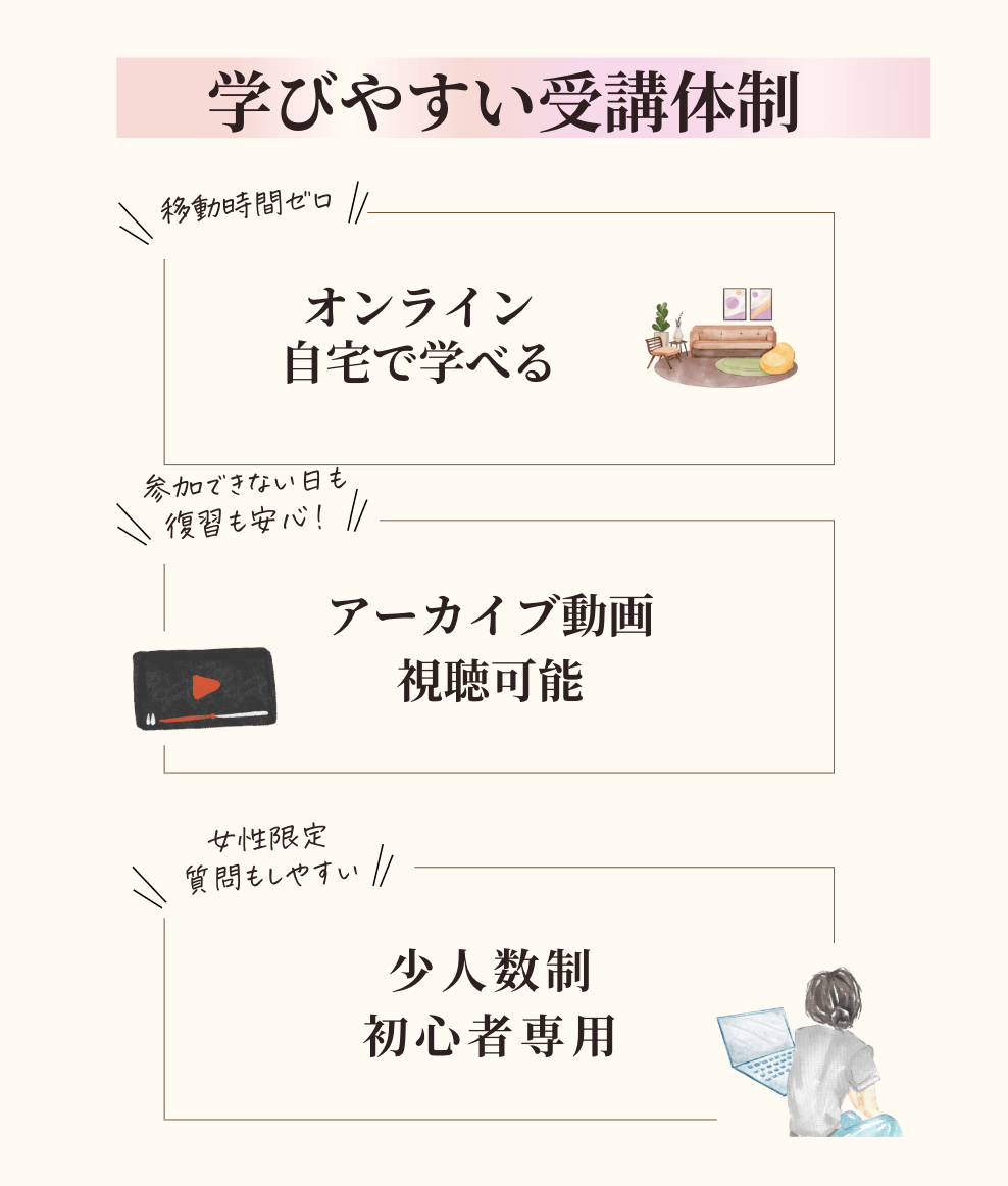 | 受講期間 | 3ヶ月講座(全6回) 第1月曜 10:00~12:00 第3月曜10:00~12:00 最終回は個別ZOOM 次期開催は2026年3月ごろ(3名程度)を予定しています |